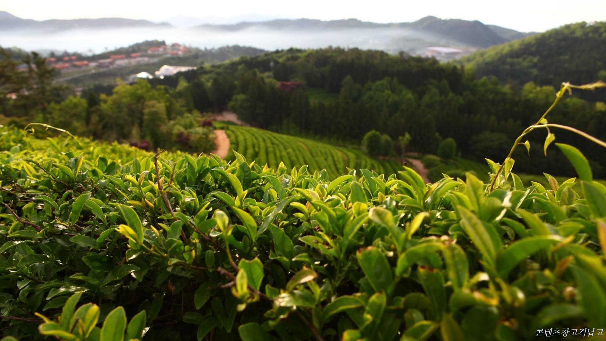 차밭에는 차만 있는 게 아니다. 차밭 꼭대기에 전망대가 있다. 녹차밭이 자리한 활성산과 멀리 보이는 봉화산 줄기에 갇혀 빠져나가지 못한 안개가 허공에 뜬 풍경은 예쁘단 말에는 담기지 않는 풍취를 지녔다. 근경과 원경의 조화가 일품이다. 그 뒤로 보이는 하늘. 하늘의 짙은 파란색이 점점 하늘색으로 변하면서 어느 순간 도로변의 노오란 가로등이 꺼지는데, 그 직전까지의 풍경이 참으로 탐낼 만하다.