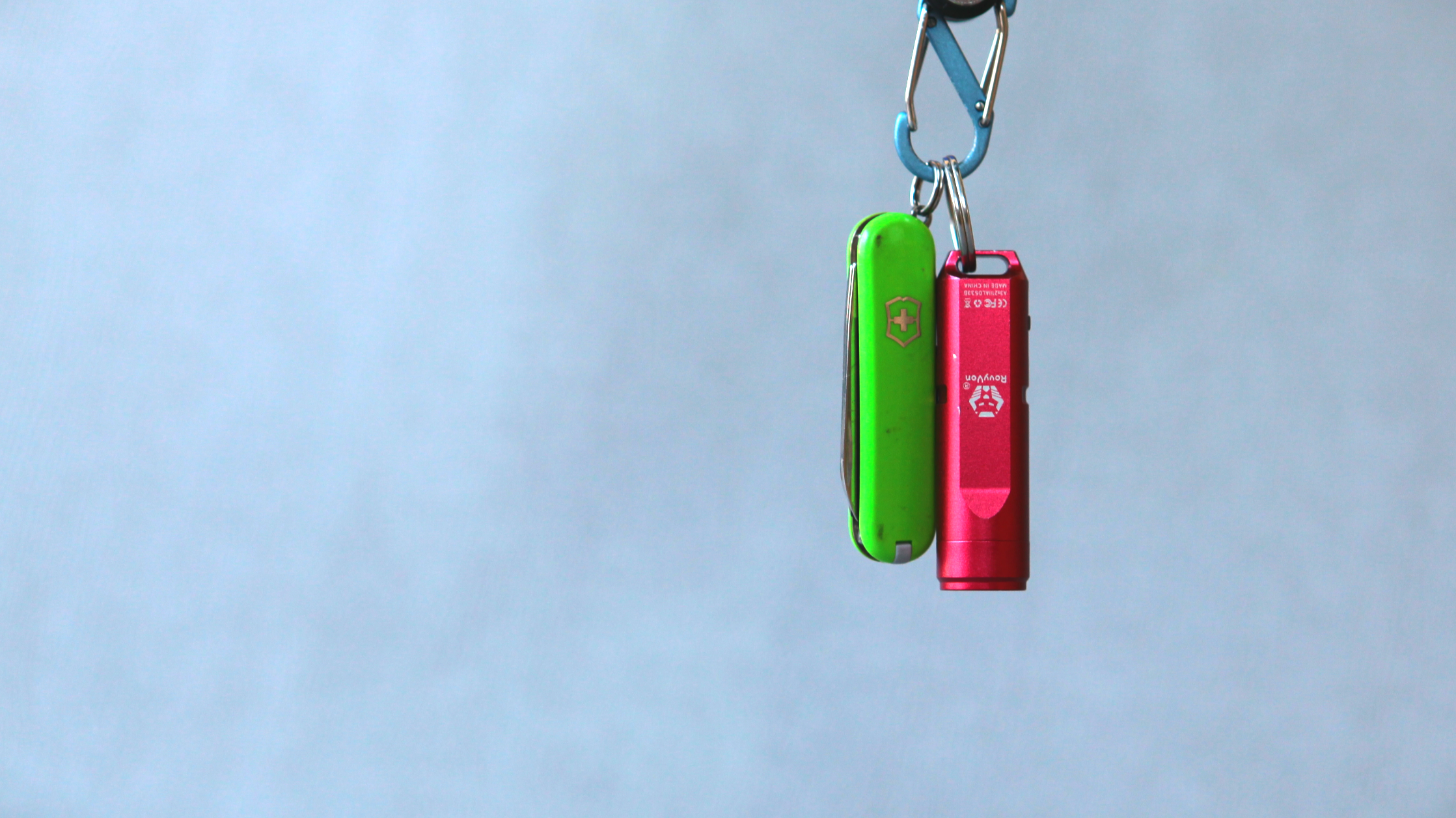 그래서 만든 게 이 조합이다. 평소에는 자동차 스마트키 열쇠고리에 끼어 가지고 다니고 자연으로 나갈 땐 사코슈나 배낭의 키홀더에 걸어 언제라도 간단하고 빠르게 꺼내 쓸 수 있도록 준비한다. 홋카이도에서 자전거를 탈 때도 이 칼과 등의 조합은 프런트백 키링에 걸려 있었다. 다행스럽게도 쓸 일은 많지 않았다. 체인이 뒷바퀴 허브에 끼었을 때 미니 랜턴으로 패니어 사이를 비추어 체인이 어디에 어떻게 끼었는지를 알 수 있었고, 맛나다는 홋카이도 우유를 종이팩으로 샀을 때 칼로 꼭지를 뗄 수 있었다. 밤에 화장실을 갈 땐 손가락 크기의 랜턴이 유용했고, 토마토 잘라 후추를 뿌려먹을 땐 저 작은 칼 이상이 필요하지 않았다.